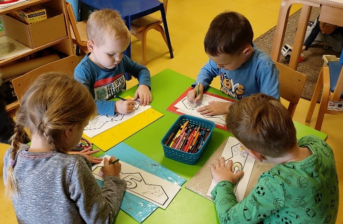 Kako bismo bolje upoznali jedni druge, igrali smo razne igre upoznavanja i predstavljanja sebe i svoje obitelji. Pomoću geometrijskih likova s kojima smo se ranije upoznali nacrtali smo svoj portret i obiteljsku kuću. Grafomotoriku smo vježbali spajanjem raznih linija i točkica u različite jesenske motive.