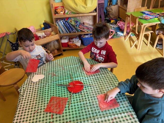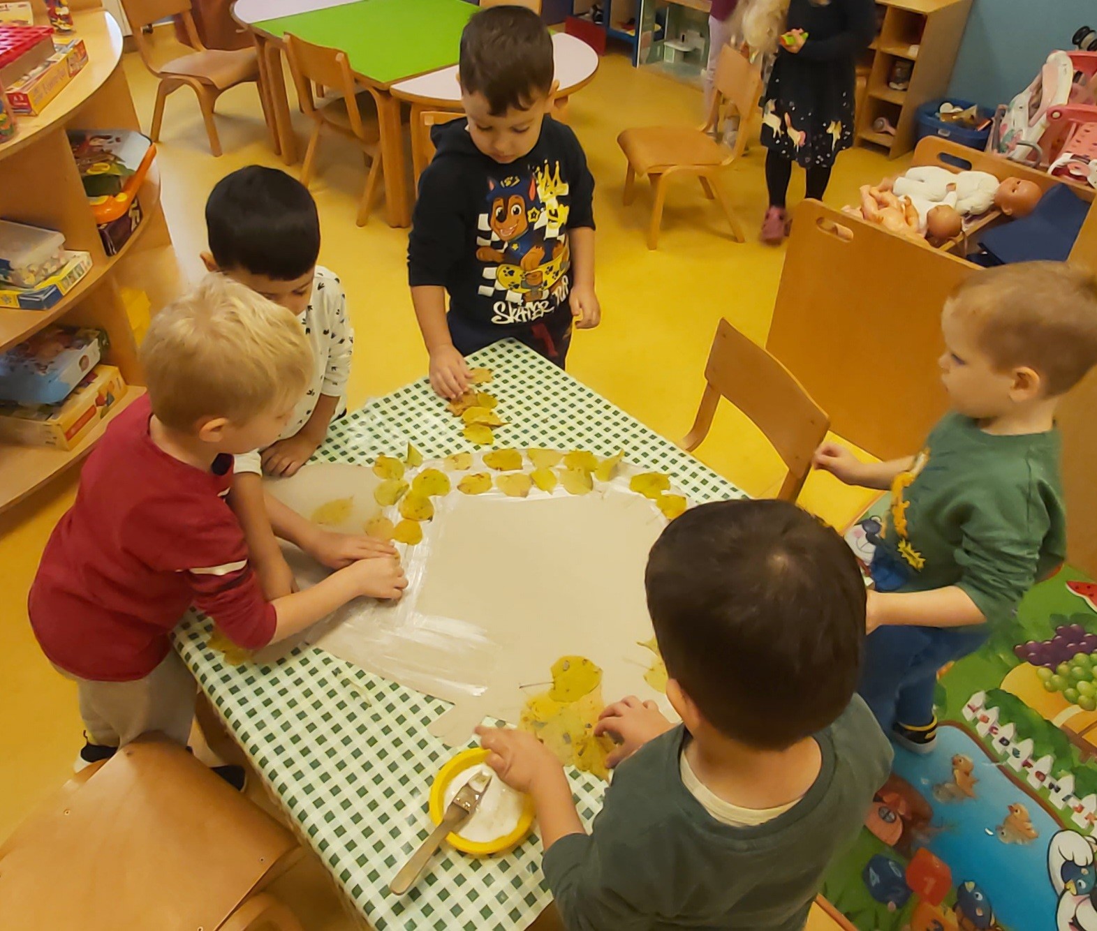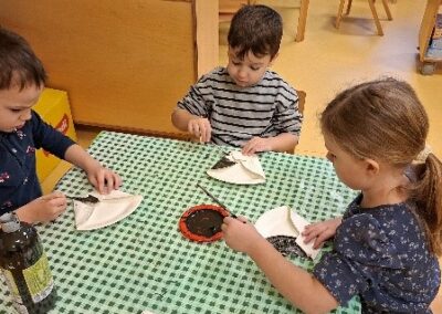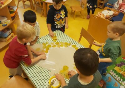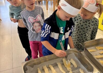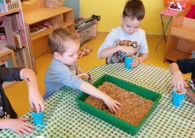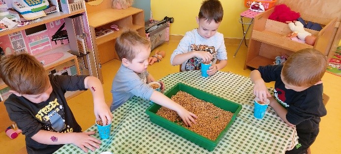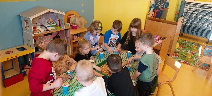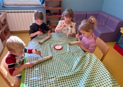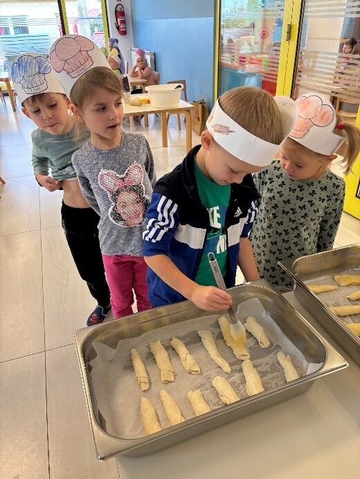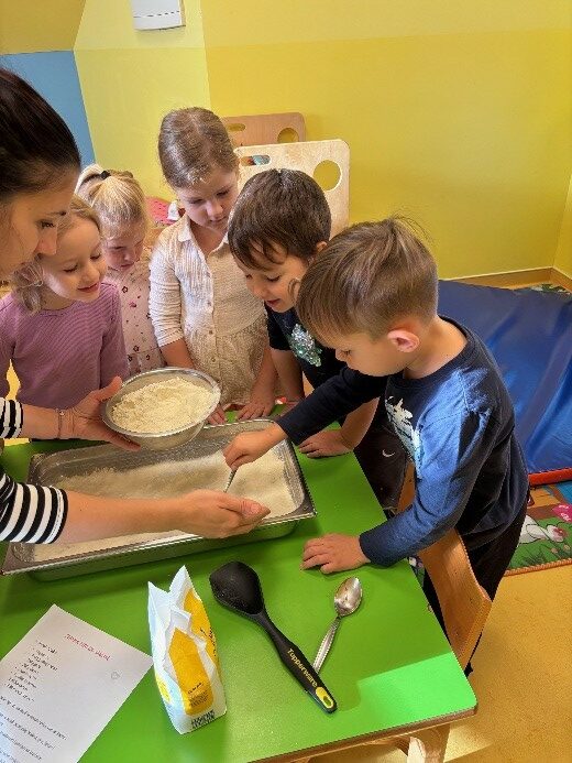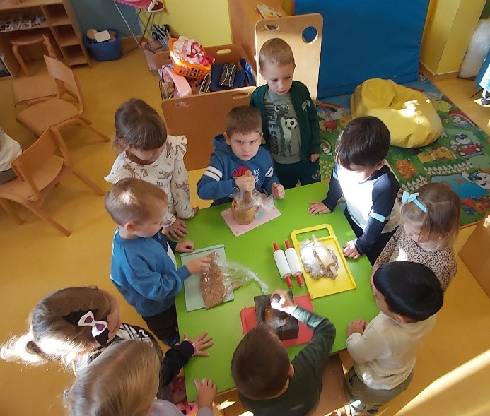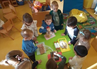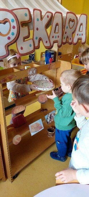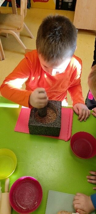 Dane zahvalnosti za plodove zemlje povezali smo s projektom „Zanimanja“- pekar. Najprije smo se upoznali sa zanimanjem pekar, tko je i što on radi. Upoznali smo se sa raznim vrstama žitarica, pokušali izraditi brašno na način da smo svaku žitaricu stavili u „mužar“ i pokušali je samljeti. Mijesili smo dizano tijesto od kojeg smo izradili klipiće kojima smo se i počastili. U Obiteljskom centru napravili smo svoju pekaru sa različitim pekarskim proizvodima. U sklopu zanimanja pekar, izradili smo kape i pregače.