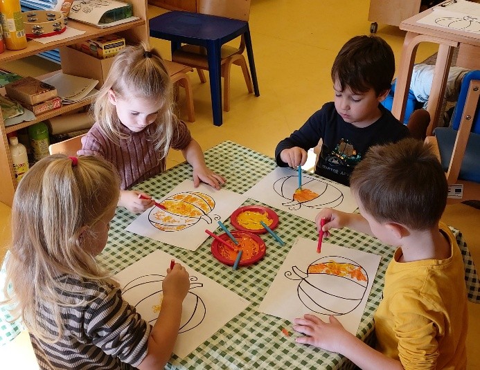Obilježili smo dolazak godišnjeg doba jeseni i tom prigodom oslikali jesenske krune na koje smo nalijepili slike različitih plodova jeseni. Dolazak jeseni promatrali smo i u prirodi te smo uočili razne promjene kao što su dozrijevanje voća, povrća te nove boje lišća.