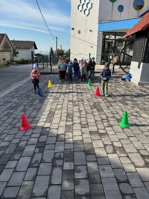 Sredinom mjeseca održali smo jesensko druženje u dvorištu vrtića. Najprije smo recitirali usvojene recitacije, a zatim smo odigrali nekoliko natjecateljskih igara. Djeca su kotrljala bundeve oko čunjeva, nosila orahe na žlici te bacala kestene u posude. Provedenim igrama razvijali smo koordinaciju ruka- noga i oko- ruka, zatim smo razvijali finu i grubu motoriku, ravnotežu, spretnost i preciznost. Ne moramo vam ni pričati koliko nam je bilo zabavno.
