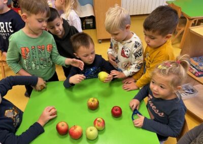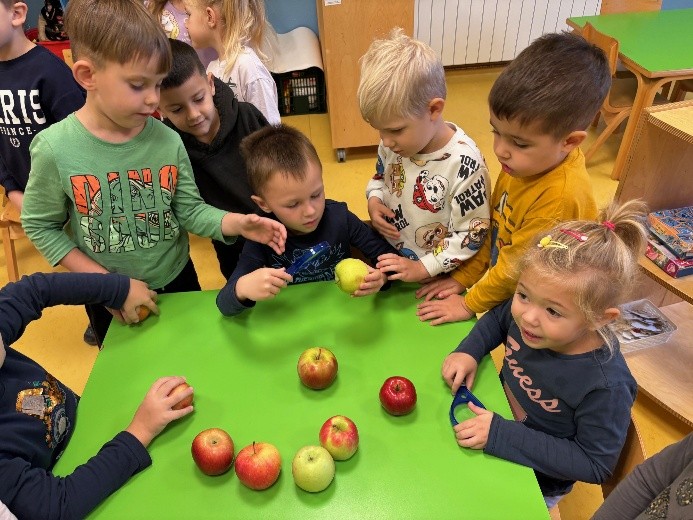 Nakon toga stigao nam je Svjetski dan jabuka. Tom prilikom upoznali smo se sa dijelovima jabuka, životnim ciklusom jabuka te smo povezivali brojeve s količinom sjemenki. Sa Svjetskim danom jabuka povezali smo projekt „Zanimanja“- slastičar. U skupinu nam je došla slastičarka koja je predstavila svoje zanimanje te nam pomogla u izradi pite od jabuka.