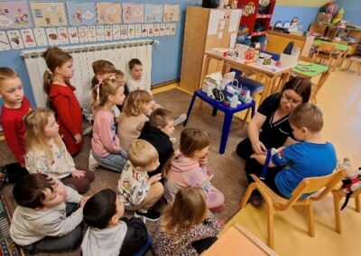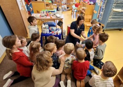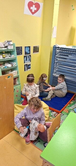 U sklopu projekta „Zanimanja“ ugostili smo mamu Ivanu Kovačić koja je po struci medicinska sestra. Gospođa Kovačić nam je na zanimljiv i djeci prilagođen način predstavila svoje zanimanje, a djeca su se imala prilike upoznati s priborom koji medicinske sestre koriste u svom radu. Nakon uvodnog dijela, prešli smo na praktični dio. Sestra Ivana pokazala nam je kako se mjeri kisik u krvi, saniraju rane te razne druge zanimljivosti. U dogovoru s djecom oformili smo našu „Ambulantu“ u kojoj se djeca svakodnevno igraju „malih bolesnika“. Ovim putem se zahvaljujemo gospođi Kovačić što je izdvojila svoje slobodno vrijeme i predstavila nam zanimanje medicinska sestra.