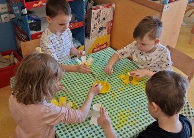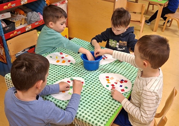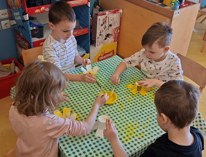 Dolaskom proljeća ukrašavali smo pano proljetnicama poput jaglaca, zumbula i narcisa koristeći razne likovne tehnike. Također smo vrijedno izrađivali ukrase za našu ustanovu – oslikane zečeve od kartona omatali smo vunom i oslikavali velika uskrsna jaja.