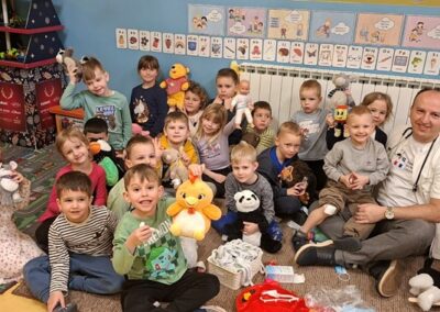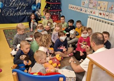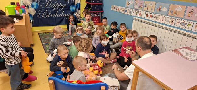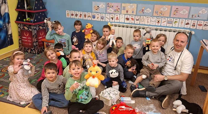 Krajem mjeseca posjetio nas je i doktor Miljenko Novak koji nam je predstavio svoje zanimanje. Razgovarali smo o tome kada idemo liječniku i što on radi. Pregledao je naše plišane medvjediće koji su bili “bolesni”, što nam je svima bilo jako zanimljivo i poučno. Također, zahvaljujemo se doktoru Miljenku na dolasku i druženju.