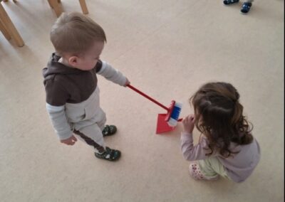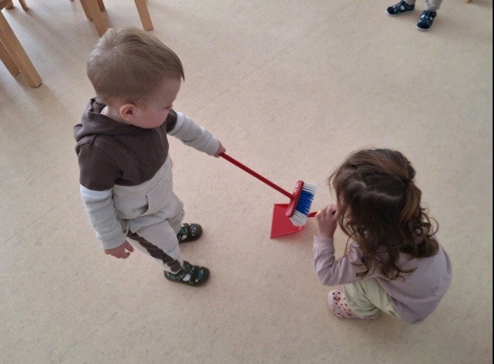 I daje razvijamo potrebu za urednošću te naviku odlaganja igračka na za to predviđena mjesta. Zajedno čistimo sobu dnevnog boravka te tako stječemo korisne životne vještine.