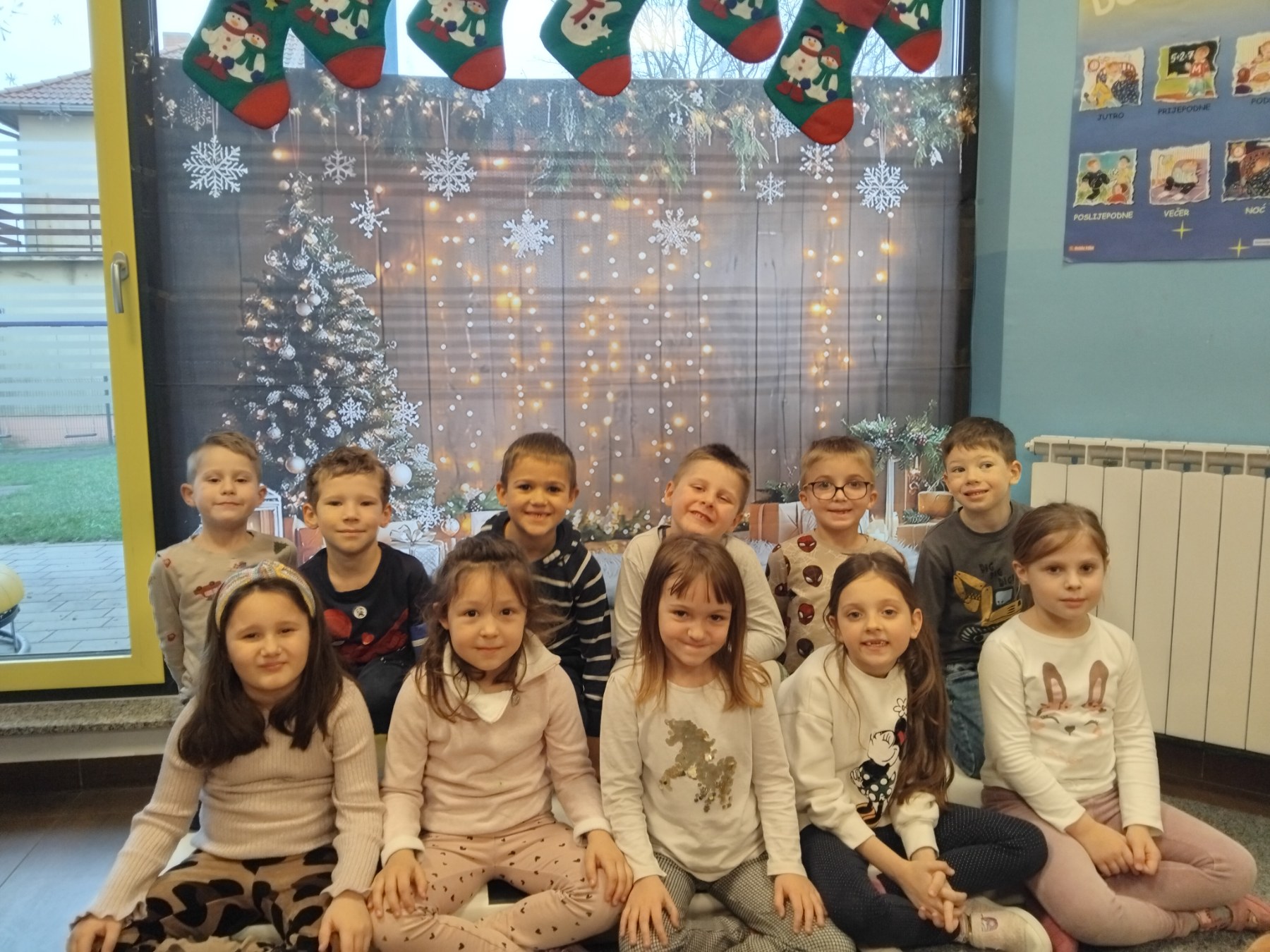 Sredinom mjeseca broj djece u grupi se naglo prepolovio jer je nažalost gripa stigla i do nas. Iz tog razloga jako tužni morali smo otkazati božićnu priredbu i druženje s roditeljima. Pripremili smo brojne recitacije koje smo učili od rujna pa sve do prosinca. Zahvaljujući tehnologiji odmah smo se dosjetili kako bismo mogli nekoliko recitacija i čestitku snimiti i poslati našim mamama i tatama u Viber grupu te ih na taj način iznenaditi i obradovati.