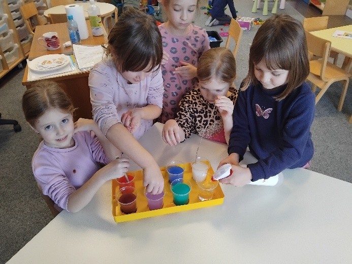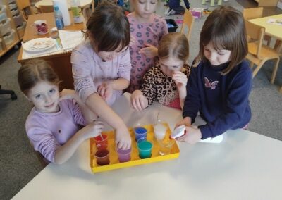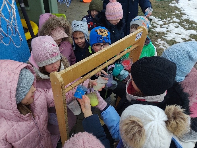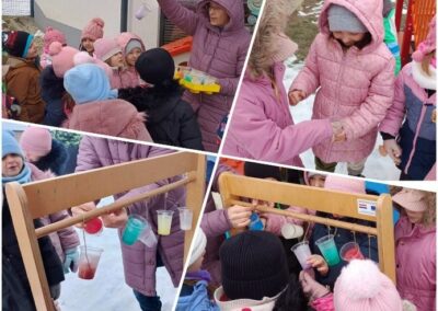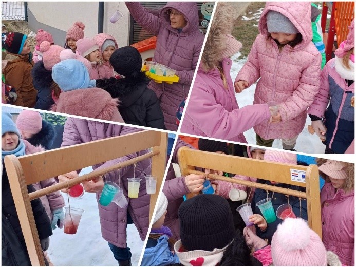 Hladno siječanjsko vrijeme poslužilo nam je za istraživačko-spoznajnu aktivnost izrade ledenica, kroz koju smo istražili agregatno stanje vode – pretvaranje vode iz tekućeg u kruto stanje. Vodu smo ulili u plastične čaše, obojili temperama u boji i ostavili na terasi preko hladne noći, a već slijedeće jutro dočekale su nas šarene ledenice koje smo cijeli tjedan promatrali kada će se početi otapati.