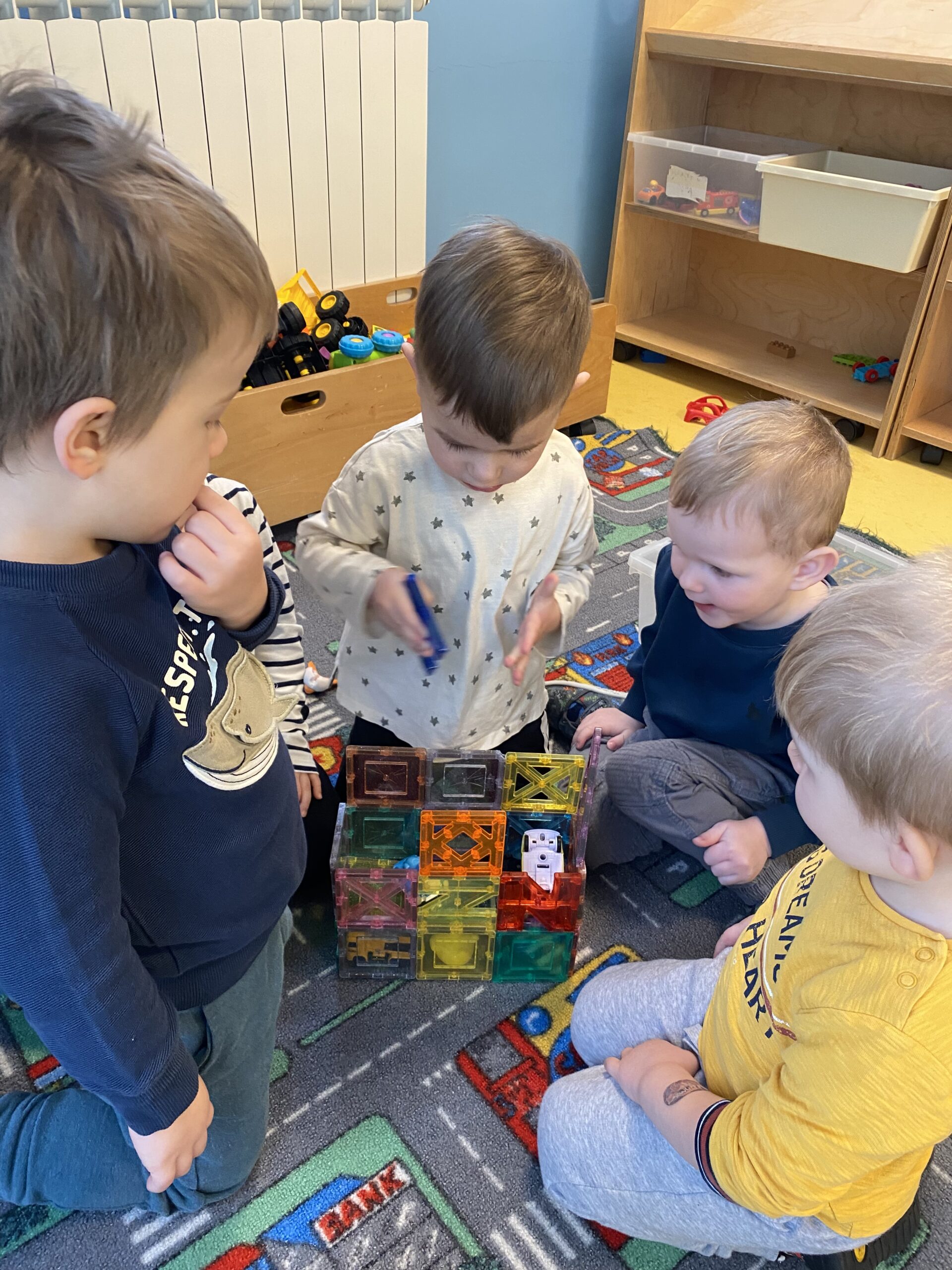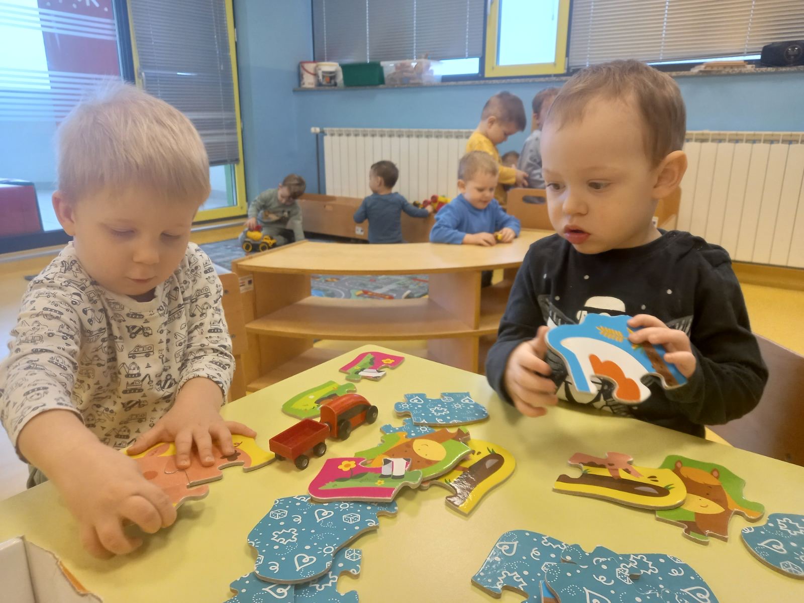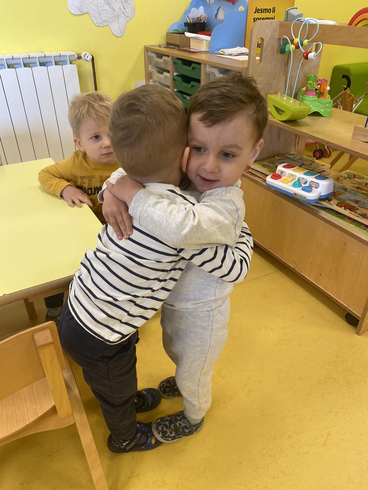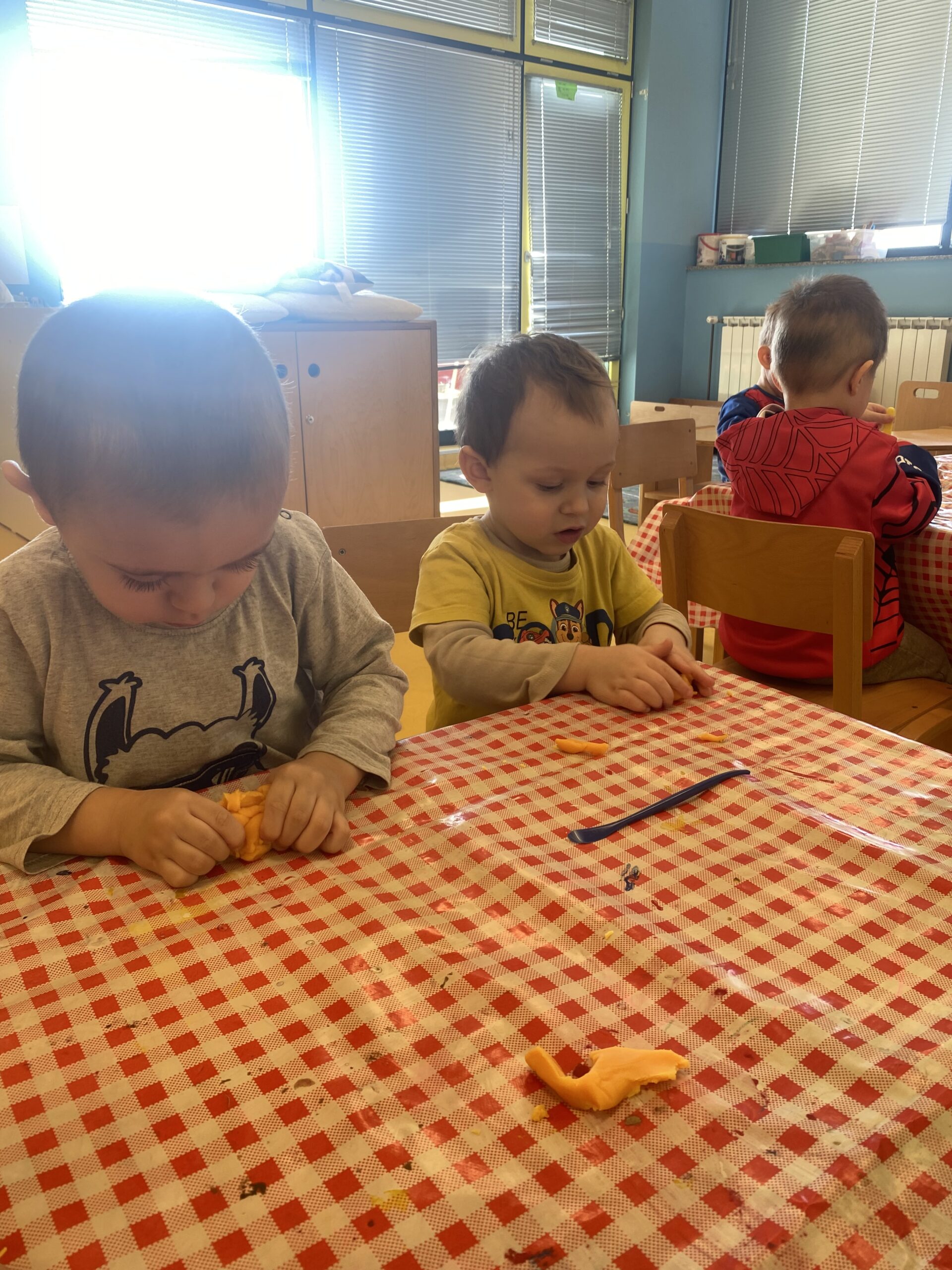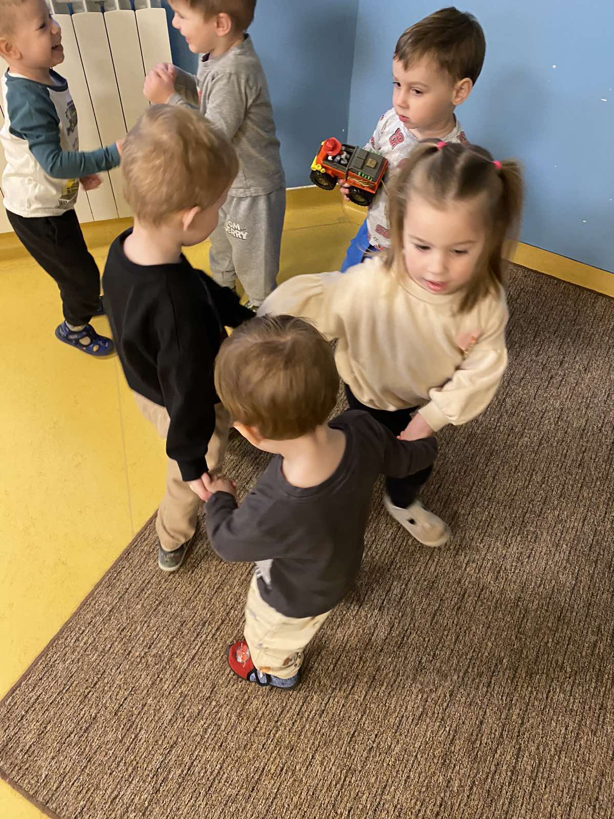Puno istražujemo, pokušavamo se dogovarati, dijeliti igračke, igrati se zajedno. Jjedna od omiljenih igara nam je „Igra kolo”, koju se često igramo dok idemo u dvoranu, ili u susjedinoj garaži dok se vani šećemo ako ne možemo na naše omiljeno igralište.