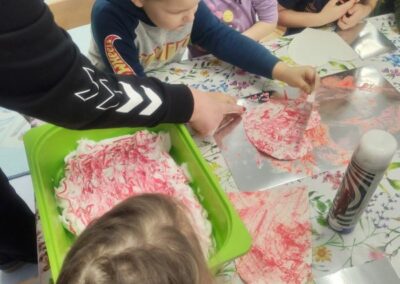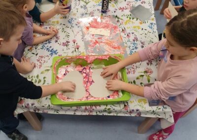 Tijekom likovnih aktivnosti djeca su izradila kišne oblake u dvije tehnike. Temperama (kombinacija plave, crne i bijele) su obojali oblake, također su plavom temperom obojali tjesteninu (fusile) koju su nakon sušenje nizali na niti koje su visjele iz oblaka. Opisanom aktivnosti djeca su razvijala finu motoriku, koordinaciju oko – ruka te strpljenje. U sljedećoj aktivnosti u vodu smo nakapali plavi tuš, zatim je svako dijete tu tekućinu nakapalo na papir te su djeca puhanjem u slamku pokušavala usmjeravati i voditi kišne kapi po papiru.