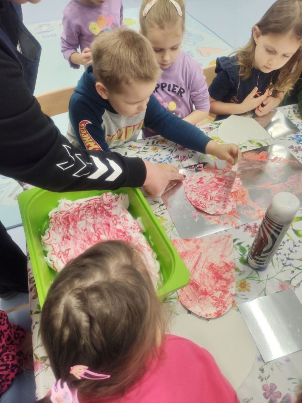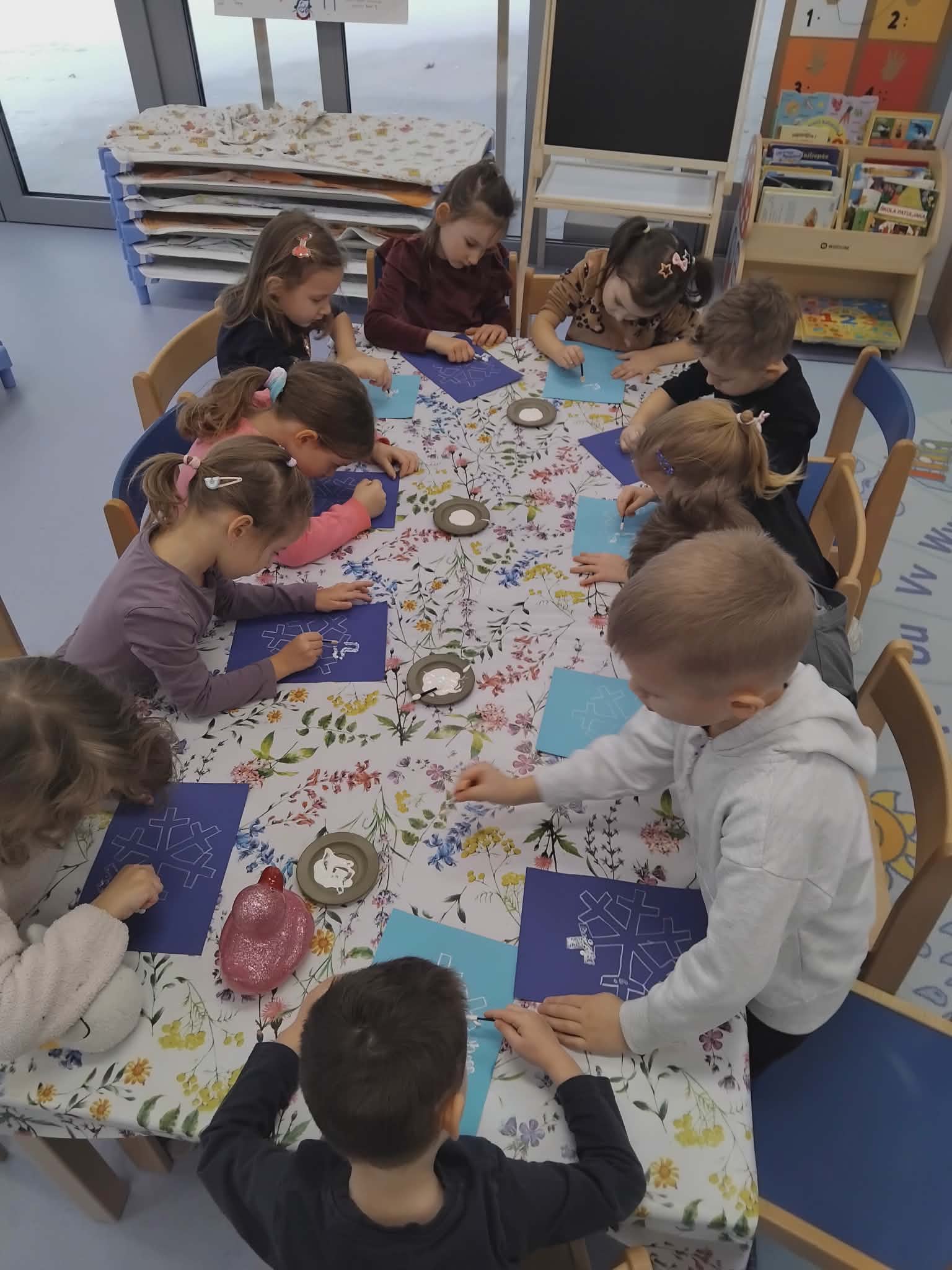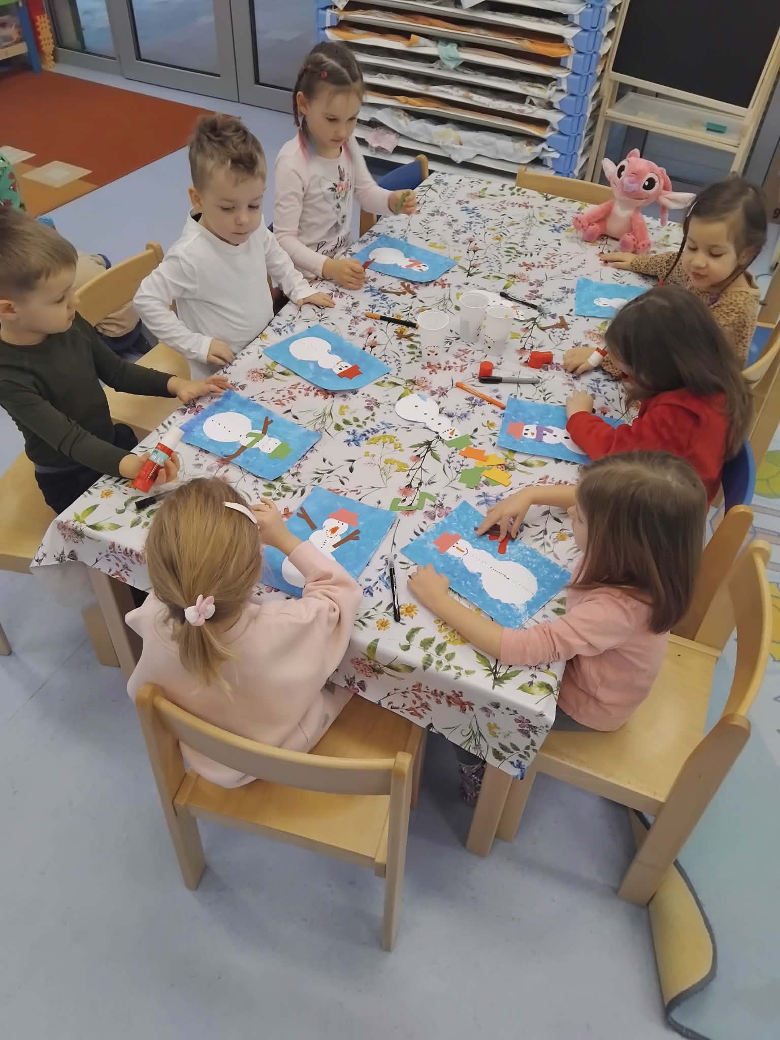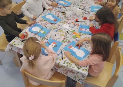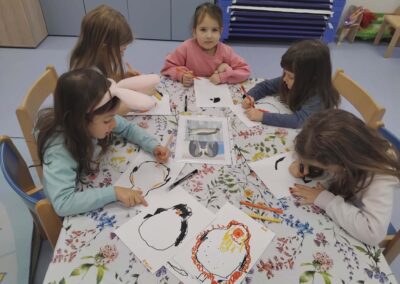 Za vrijeme likovnih aktivnosti djeca su izradila pahuljice, tehnikom tapkanja bijelom temperom i štapićem po zadanim linijama. Zatim, su tehnikom kolaža izradili snjegoviće, flomasterom ih ukrasili, a otiskivanjem bijele tempere uokolo stvorili privid pahulja snijega. Otiskivanjem kockice u plavu temperu pa na bijeli papir djeca su izradila pozadinu na kojoj su kasnije iz tehnike kolaža izradila svog polarnog medvjeda, flomasterom su mu nacrtali lice. Promatrajući fotografiju pingvina svako dijete flamsterom je nacrtalo pingvina. Također, imali su isprintane bojanke s antarktičkim i artičkim životinjama koje su prema vlastitom interesu bojali bojicama ili pastelama.
