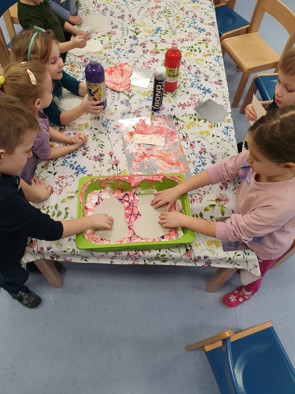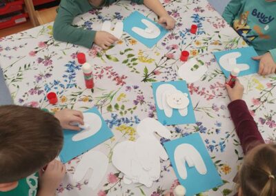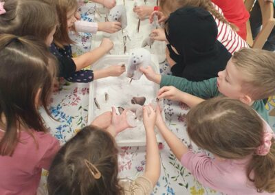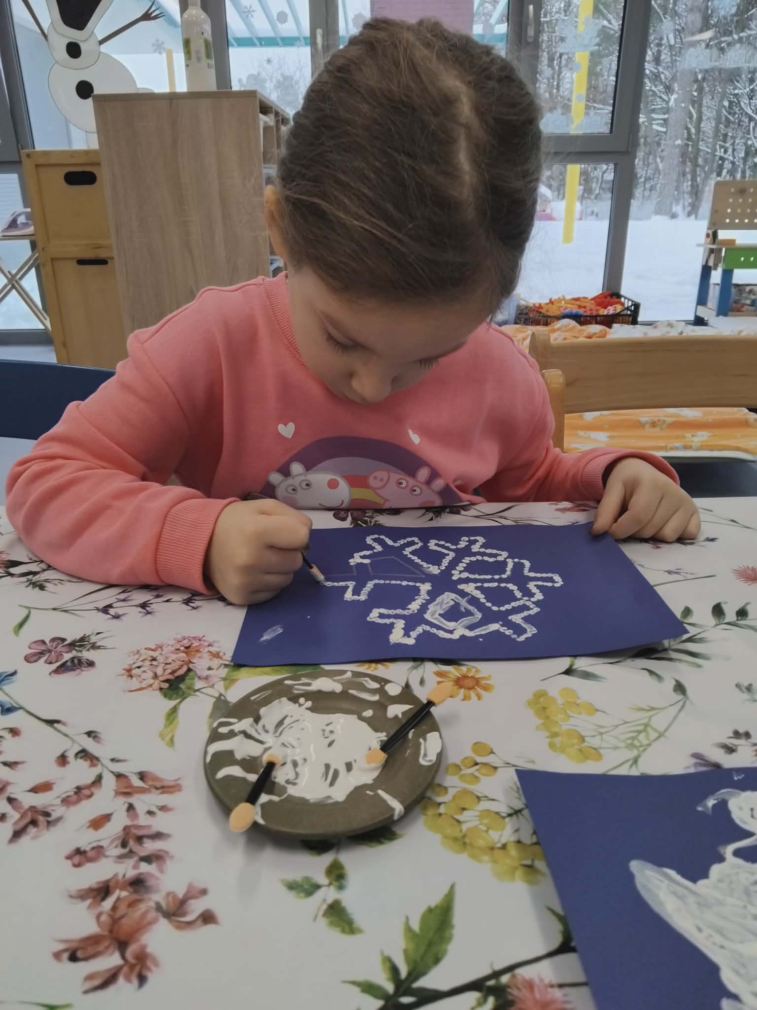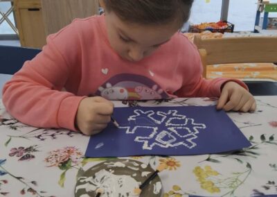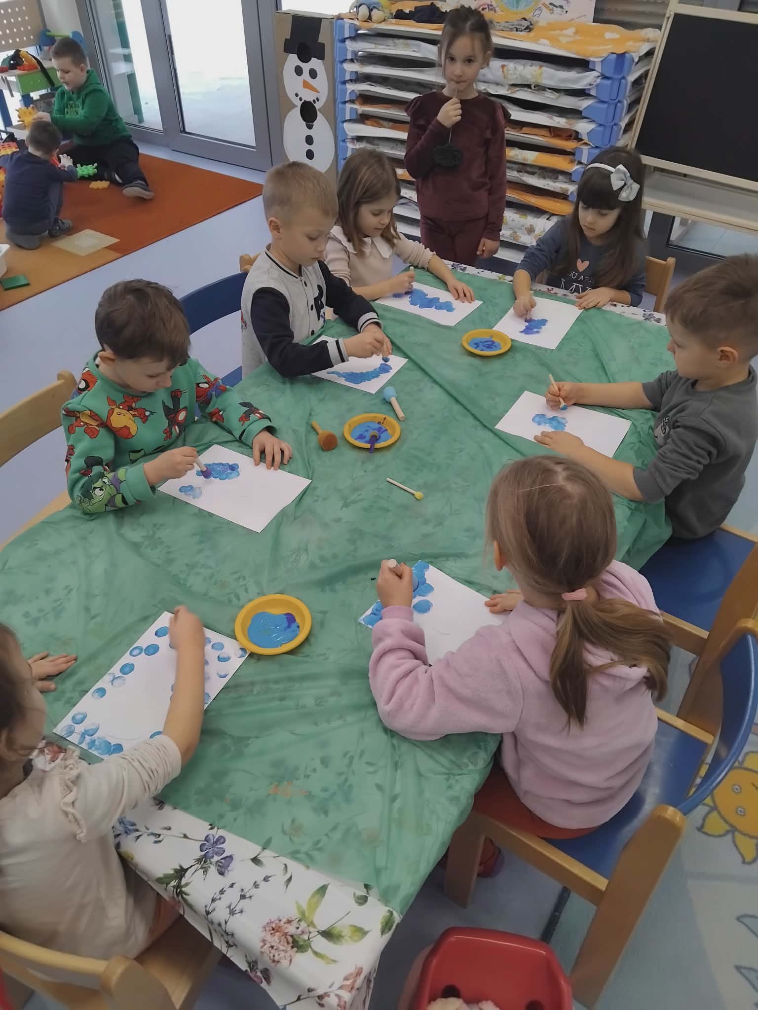 Za vrijeme likovnih aktivnosti djeca su izradila pahuljice, tehnikom tapkanja bijelom temperom i štapićem po zadanim linijama. Zatim, su tehnikom kolaža izradili snjegoviće, flomasterom ih ukrasili, a otiskivanjem bijele tempere uokolo stvorili privid pahulja snijega. Otiskivanjem kockice u plavu temperu pa na bijeli papir djeca su izradila pozadinu na kojoj su kasnije iz tehnike kolaža izradila svog polarnog medvjeda, flomasterom su mu nacrtali lice. Promatrajući fotografiju pingvina svako dijete flamsterom je nacrtalo pingvina. Također, imali su isprintane bojanke s antarktičkim i artičkim životinjama koje su prema vlastitom interesu bojali bojicama ili pastelama.