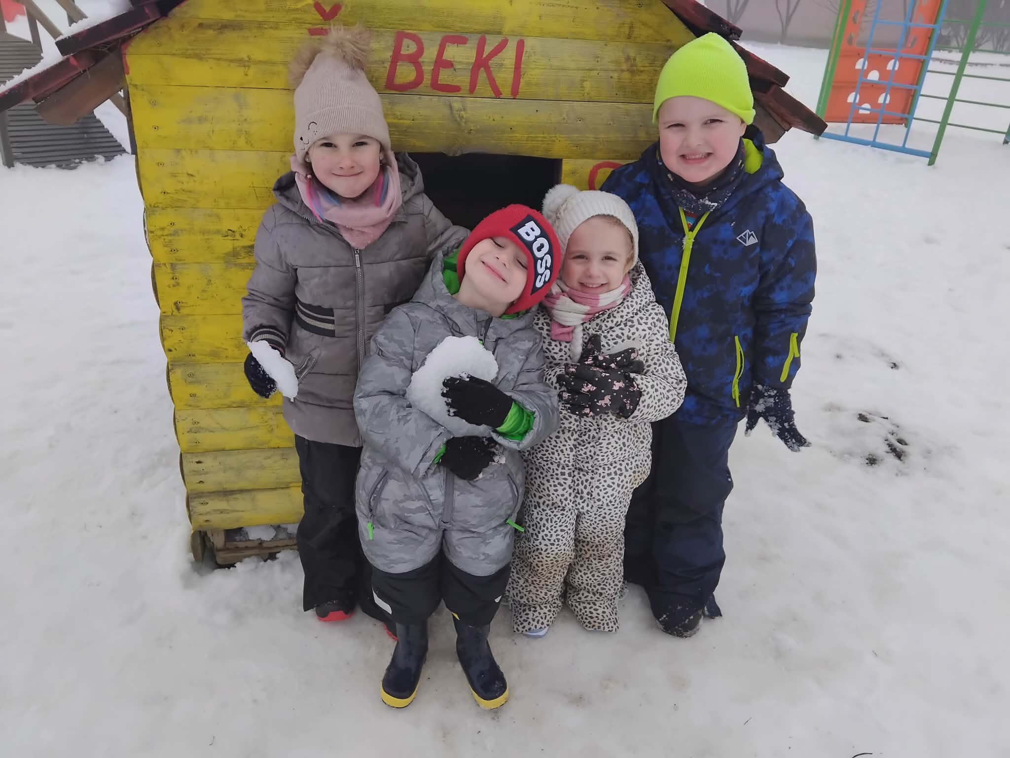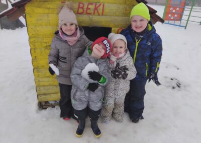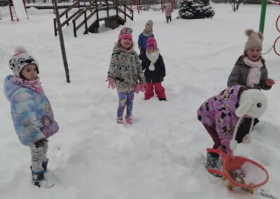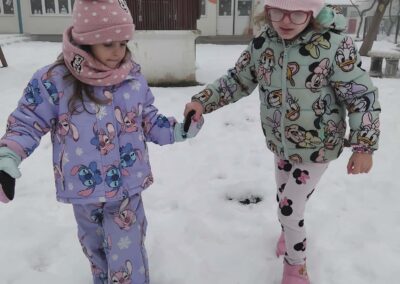 Kroz cijeli mjesec smo u sobi imali organizirane snježne aktivnosti, a u dva navrata smo u dogovoru s roditeljima izašli van na snijeg, uživati u sniježnim radostima. U prikladnoj zimskoj odjeći, djeca su jako uživala u zimskoj idili na vrtićkom igralištu. Radili smo sniježne anđele, grudali se, trčali po snijegu, radili sniježne otiske, spuštali se po ledenom toboganu. Nažalost, nismo uspjeli izraditi snjegovića jer nam je kod prvog izlaska snijeg bio previše suh, dok je snijeg kod drugog izlaska van bio smrznuti i tvrd.