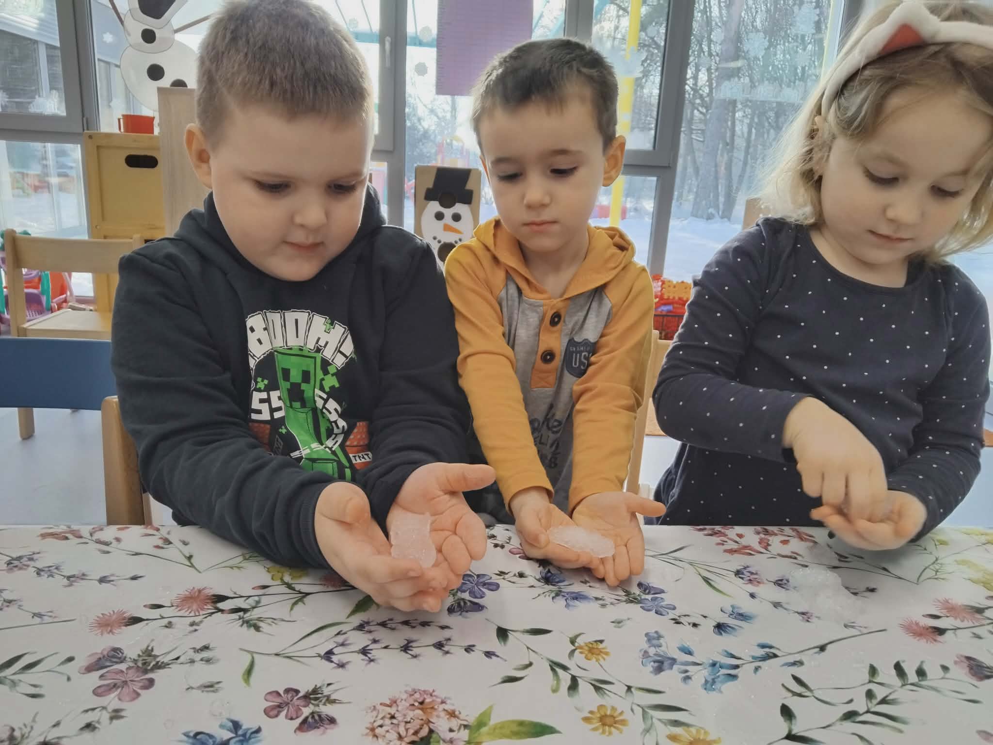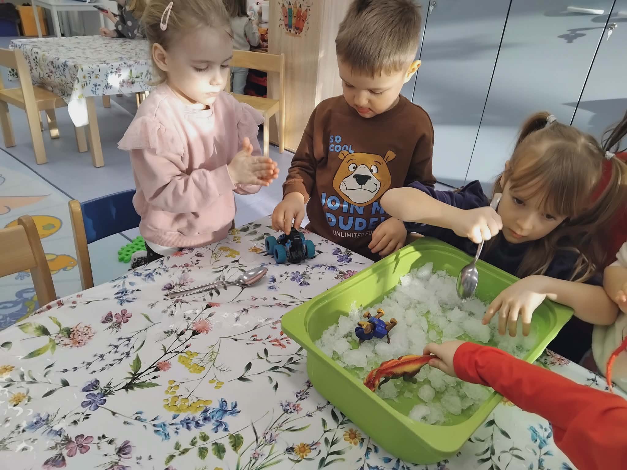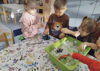Led i snijeg smo u više navrata unijeli u sobu u plastičnim kadicama, kako bi djeca imala prilike kroz igru istraživati; uvidjeti razliku između leda i snijega, uočiti što će se prije otopiti te što nastaje topljenjem. Dvojica dječaka su samostalno zaključila da ukoliko vodu ostavimo vani na „ledenoj hladnoći“ ona će se opet pretvoriti u led.