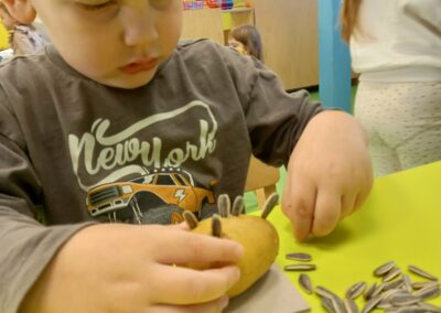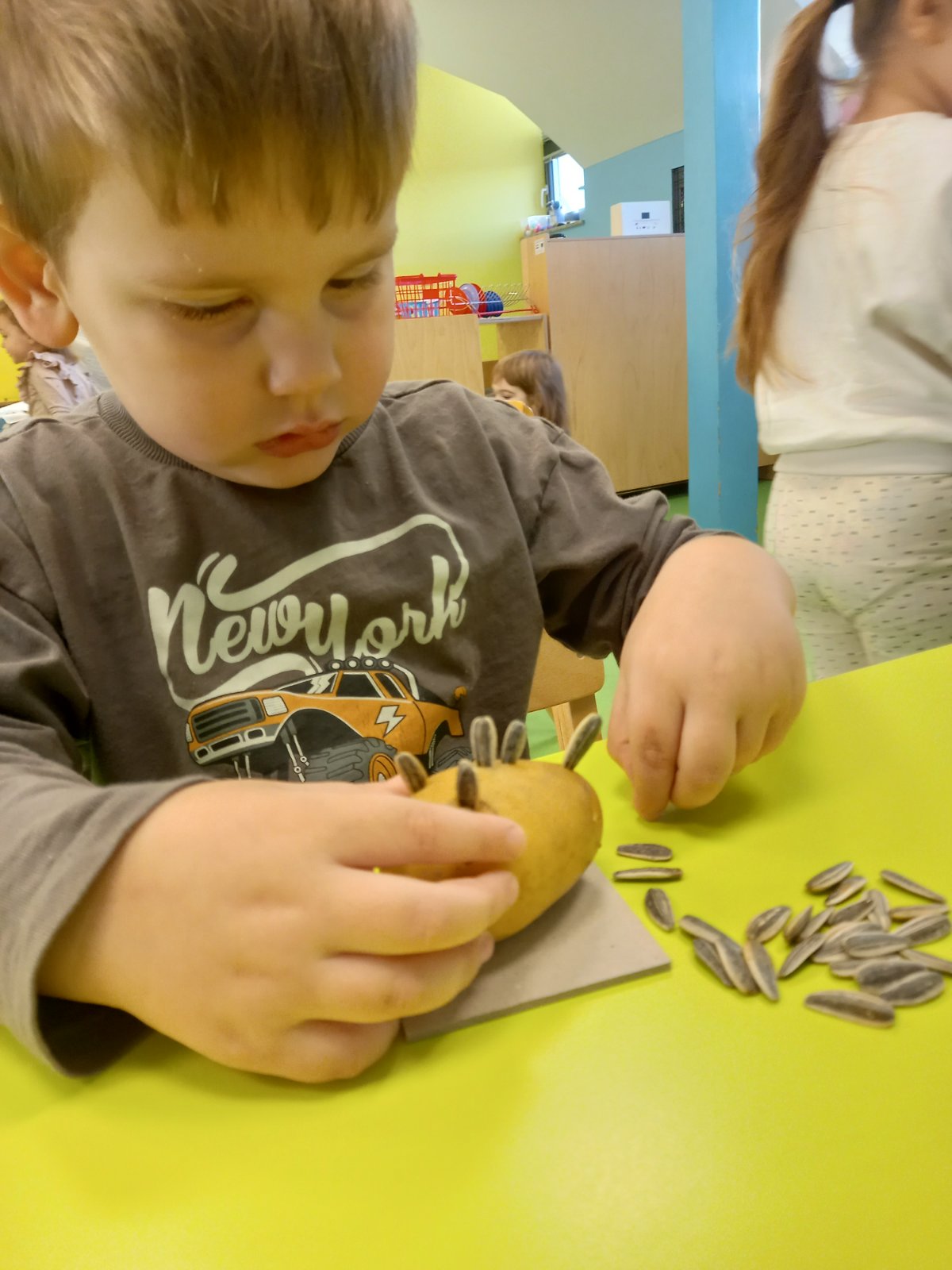 Nekoliko dana posvetili smo istraživanju ježeva. Promatrali smo fotografije, razgovarali o njima, dobro proučili našeg plišanog ježića u sobi pa ih potom izrađivali od krumpira i suncokretovih sjemenki. Uz pomoć odgojiteljica i otisaka ručica, izradili smo velikog simpatičnog ježa kojim smo se pohvalili na panou ispred naše sobe.