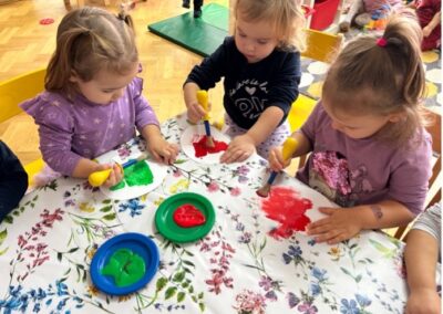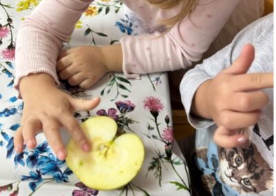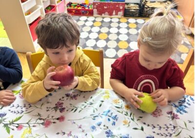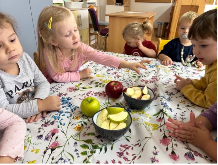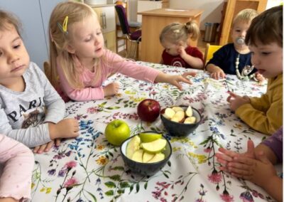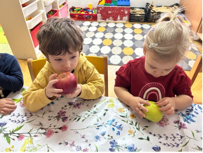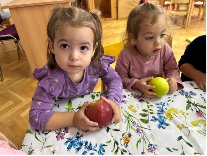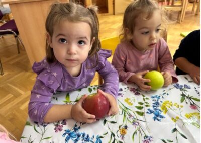 Posebno smo obilježili i Dan jabuka. Djeca su kroz igru istraživala jabuke različitih boja i oblika (crvene i zelene, velike i male), kušala ih, mirisala i slikala temperama. Bilo je šareno, mirisno i vrlo ukusno!