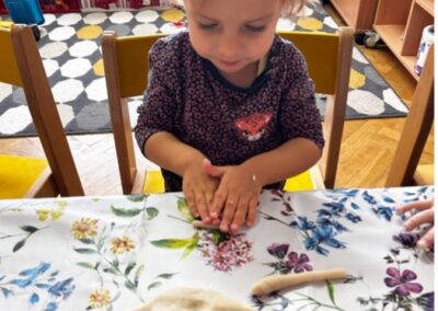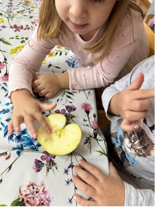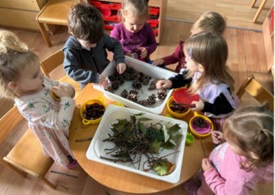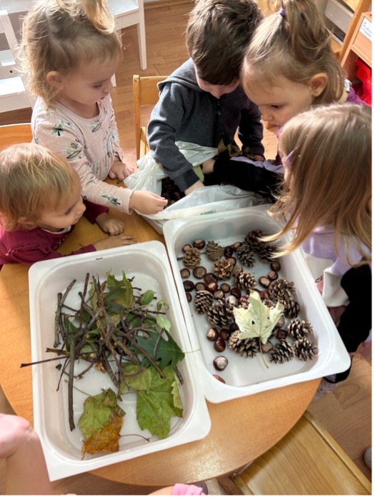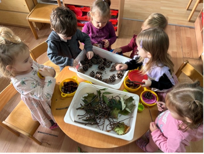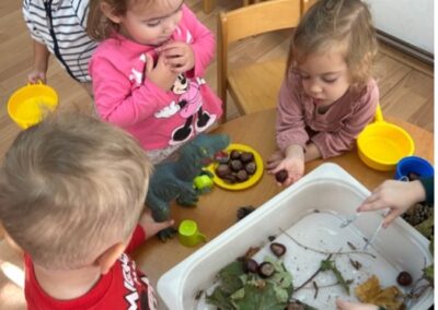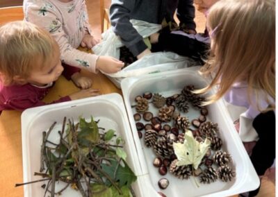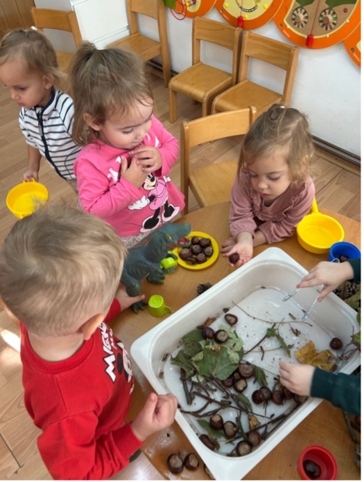 U sklopu istraživačkih aktivnosti proučavali smo jesenske plodove – kestene, lišće, češere, grančice… Djeca su ih opipavala, promatrala, uspoređivala i koristila u igri. Time smo poticali dječju znatiželju, istraživački duh i osjetilno iskustvo.